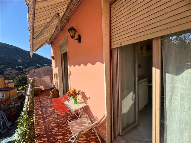 La cucina e una delle camere godono dell’accesso diretto a un terrazzo angolare con affaccio aperto e arioso, ideale come sfogo esterno vivibile.